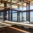 - Lutron Motorized angled Sunscreen shades with guidewires.
