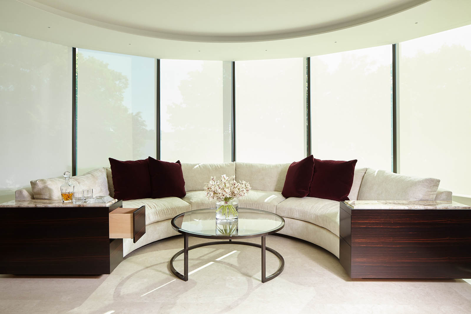 A new residence outfitted with Lutron motorized Rollershades, Lutron motorized Roman Shades and Draperies. Two condominiums were combined together in this amazing project to create a two level residence. Particular attention was paid to matching the Roman Shades and the Draperies with the fabric wall coverings in the Bedrooms and Den. The flap which closes the pocket in the ensuite was clad with marble to blend in with the rest of the finish in the room.