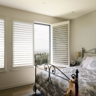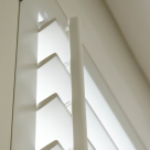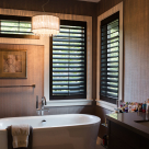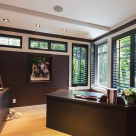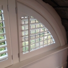 Custom made wood shutters create a cozy look for any room and can be painted or stained to match any finish. The horizontal slats allow you to control the light by tilting them and closing them completely when you want to create privacy. Shutters are excellent in angles and arches as well, as they can be scribed to fit most unusually shaped windows.
